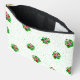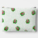 Esta bolsa de cosmética y de tocador es blanca con puentes de polka verde vibrante y cubierta de esqueletos de Navidades con sombreros de Santa roja dentro de formas de blob verde brillante y rojo que sostienen adornos hasta los ojos.
