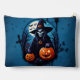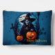 Escena espeluznante de Halloween con una bruja esquelética. Su cuerpo deshuesado está adornado con una capa negra hecha jirones y el gorra de una bruja puntiaguda que flauta en el viento. Hay calabazas brillantes de varios tamaños, cuyas caras talladas se ven alegres y aterradoras al mismo tiempo. Algunas calabazas emiten una luz cálida y naranja. La paleta de colores está compuesta por tonos oscuros como el negro y el azul, combinados con acentos de naranja