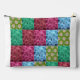 Handcrafted floral quilt design featuring vibrant patchwork blossoms in blue, pink, and green