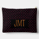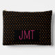 Esta bolsa negra para accesorios tiene un monograma rosa brillante en la parte delantera y un monograma naranja en la parte posterior. Tiene letras que se pueden cambiar al monograma o nombre correcto en ambos lados. Todo el texto se puede editar o eliminar. Los puntos naranjas están de un lado y un patrón de puntos rosados del otro lado.