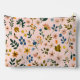 This fun wildflower garden design will bring the happiness of a blooming meadow into your daily life. This pattern has a lot of personality, with delicate blue flowers, bright yellow accents, and leafy green sprigs that look like they were just picked from a sunny field. The background is a soft peach color. It's fun, modern, and has just the right amount of silliness and class.