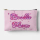 This vibrant accessory pouch showcases a "Doodle Mom" design with heart-patterned typography on a pastel pink background.