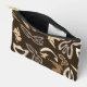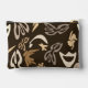 Bolso de accesorios pequeño en color marrón y estampado con elementos botánicos y formas abstractas, donde los elfos y sus máscaras se mezclan entre el aleteo de las mariposas.