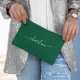 Bolso de accesorio de nombre de guión de firma elegante en verde y blanco para las damas de honor. Cambie el color de fondo para que coincida con la paleta boda. Si cambia el color del tipo de letra blanco, asegúrese de comprobar dos veces que también personalizar el color de la sombra de caída. El estilo de letra es un elegante y moderno guión de caligrafía manuscrita de tipo swash.