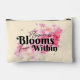 Esta bolsa accesoria para una mujer, incluye la inspiradora cita "La felicidad florece desde adentro" y flores de color de agua rosa bonito. Use esta bolsa como una bolsa de cosmética, una bolsa de artículos de aseo, para un kit de viaje, un funda de lápiz y más.