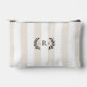 Con esta bolsa de monograma a rayas de Redwood & Vine Design Co. Diseñada con rayas beige y blancas y una corona de laurel negra refinada, su personalizable con sus iniciales le aporta un toque personal. Ideal para la organización de cosméticos, artículos de aseo o pequeños accesorios, esta bolsa también hace un regalo de dama de honor o un bigote de boda.