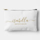 Esta bolsa de maquillaje y accesorios de la dama de honor presenta una tipografía de escritura dorada escrita a mano con toques en un fondo blanco o medianoche. Presenta a las damas de honor un neceser para su maquillaje y objetos pequeños presentados tradicionalmente en la cena de ensayo, para su uso temprano por la mañana antes del boda.