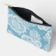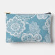 Floral azul bebé y blanco es un hermoso arte de IA que muestra un fondo azul claro con patrones de encaje blancos. Es la perfecta bolsa de accesorios de moda para mejorar tu estilo este año.