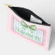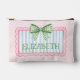 This cute personalized cosmetic accessory zippered pouch features a pink frame with blue and white stripes and topped with a preppy green and white gingham plaid bow on a background of pink and white polka dots. Personalize each side with your choice of name or special text. Great for party favors and gift bags.