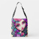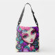 Esta es una divertida bolsa de cuerpo cruzado que presenta un caprichoso ilustracion de un chica de color morado, rosa y turquesa sobre un fondo amarillo claro.