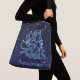 Bolso de impresión con el símbolo de Aquarius en azul plateado suave, cubierto con las estrellas de la constelación, contra un fondo estrellado del cielo clasificado de azul oscuro a negro.