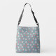 Las flores en crema y naranja bailan a través de un fondo azul, cubriendo este tote con su patrón.