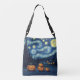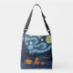 Este bolso de cuerpo cruzado presenta una divertida obra en la pintura de Van Gogh de la noche estrellada, con un toque de Halloween. Esta es una divertida adaptación de Halloween a una famosa pintura.