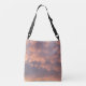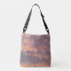 La obra de arte de esta bolsa de objetos cruzados es una fotografía original de ZoeSPEAK, tomada una noche mientras el sol se ponía. Las nubes parecen pelotas hinchadas de algodón, todo rosa a la luz de la puesta de sol. Incluso el cielo azul tiene un matiz rosado. Un toque de tintes amarillos acerca la banda de la nube al sol.