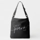 Big Crossbody Tote Bag Personalizado para la música de piano con su nombre impreso en ella con un moderno y elegante guión de caligrafía escrita a mano en blanco y negro. Los colores se pueden cambiar haciéndolos perfectos para que muchos niños almacenen sus hojas y sus libros de piano en casa y los lleven a clases.