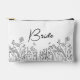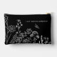 Excelente para la despedida de soltera...Bolso de cosméticos / accesorios con nombre en guión floral elegante en negro y blanco con un aspecto bohemio de moda, dibujado a mano. Pulcro y elegante, este diseño te permite incluir una línea de texto reflexivo (o práctico) en el reverso. Esta floral moderna y minimalista es un favorito seguro.