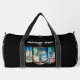 This black duffle bag features a charming nautical-themed design with a sailboat, an anchor with a fish and dolphin, and a lighthouse, along with the text "CASTAWAY VIBES." Perfect for beach lovers and sailing enthusiasts. Edit color of the bag caps and body in the Design tool to your favored colors.