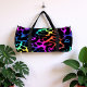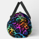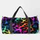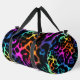 This image features a duffel bag adorned with a visually striking leopard print pattern. The spots of the leopard print are rendered in a vibrant, multi-colored faux fur texture, showcasing a spectrum of rich hues including blues, greens, yellows, oranges, and various shades of pink and purple. These colorful, textured spots contrast sharply against the dark, likely black, background. The bag is equipped with black carrying straps. This design offers a playful yet bold statement, making it an ideal accessory for those seeking a unique and eye-catching travel or gym bag.