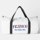 Bolsa de duffle personalizada que presenta la palabra FRANCIA en la tricolor francesa azul, blanco y rojo. Cada letra contiene los tres colores. Agregue un nombre para crear algo especial para usted o un regalo. A papá o a mamá les encantará honrar su herencia en el Día del Padre y el Día de la Madre. Ideal para reuniones familiares, grupos de viajes y clubes. Por último, pero no menos importante, es bueno para celebrar el Día de la Bastilla. Divertido por viajar o volver a la escuela.
