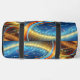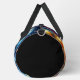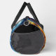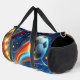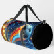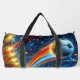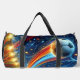 This duffle bag features a vibrant and dynamic design centered around a soccer ball in motion. The background is a rich dark blue, from which emanate streaks of glowing light in fiery oranges, reds, and bright blues, suggesting speed and energy. Stars and abstract light trails further enhance the sense of movement and excitement. The soccer ball itself is depicted with realistic shading, appearing to be in mid-flight or at the center of this energetic display. The bag has practical black handles and a mesh side pocket.