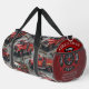 This duffle bag boasts a dynamic pattern featuring an array of red fire trucks with yellow stripes, alongside scattered fire axes. The realistic illustrations are set against a muted background that combines shades of gray and hints of yellow, creating an immersive scene. This design is perfect for those who admire the brave work of firefighters and emergency services. A prominent side pocket, adorned with a red fire department emblem, proudly displays "FIRE RESCUE," "JENNY SAMSMITH," "FIRE DEPARTMENT," and "Vancouver B.C.," creating a personalized and functional item for a firefighter. Personalize with your name and department home town and more. monogram