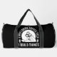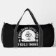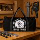 This black duffle bag is perfect for any woodworker or builder whose day starts with coffee! It features a design with coffee beans and a bag of coffee within a circular saw blade, stating "FIRST I DRINK COFFEE THEN I BUILD THINGS." It's an ideal gift for carpenters, DIYers, and anyone fueled by their morning brew and passion for creation. Edit color of the bag caps and body in the Design tool to your favored colors.