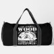 This black duffle bag is perfect for woodworkers and crafters, declaring "I TURN WOOD INTO THINGS" and asking "WHAT'S YOUR SUPERPOWER?" The design features a hammer, saw, and other tools, making it an ideal gift for anyone who loves creating with wood. Edit color of the bag caps and body in the Design tool to your favored colors.
