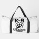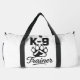 This white Duffel bag is perfect for any K-9 trainer or dog enthusiast, featuring a bold "K-9" graphic above a paw print with a dog silhouette, and the word "Trainer" in a stylish script font. It's an ideal bag for carrying training gear, gym clothes, or essentials for a weekend with your canine companion. Edit color of the bag caps and body in the Design tool to your favored colors.