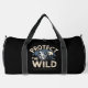 This black duffle bag features a striking design with a howling wolf silhouette against a moonlit, forested backdrop, accompanied by the powerful text "PROTECT THE WILD WILDLIFE CONSERVATION." It's a strong visual statement for conservationists and animal lovers advocating for the preservation of natural habitats.
