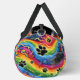 This dynamic Gear bag explodes with a vibrant rainbow Tie Dye swirl, featuring bold black paw prints, lightning bolts, and a charming dog's face. It's an electrifying Kit bag and an exciting Weekender for thrilling excursions.