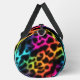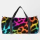 This image displays a duffel bag featuring a captivating leopard print design where the spots appear to be outlined with a vibrant, glowing rainbow effect. The "fur" within the spots transitions smoothly through a spectrum of colors including blue, green, yellow, orange, pink, and purple, creating a striking contrast against the dark, possibly black, background. The bag has black carrying straps. This unique and eye-catching design gives the duffel bag a dynamic and playful look, perfect for adding a pop of color and personality to any outing.