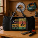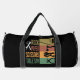 This black duffle bag features a clever twist on a classic game, showing "ROCK PAPER SCISSORS TABLE SAW" with corresponding tool graphics: a hammer/wrench, hand saw, pliers, and a table saw icon. With colorful striped panels, it's a perfect humorous gift for carpenters, woodworkers, and DIY enthusiasts who love their tools. Edit color of the bag caps and body in the Design tool to your favored colors.