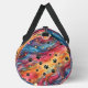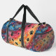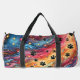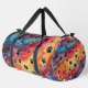 This colorful pattern duffle bag features a mesmerizing swirling cosmic design in vibrant hues, liberally accented with classic black paw prints and twinkling stars. It's a unique and stylish pet accessory, perfect as a travel storage carrier for any pet lover.