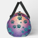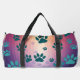 This colorful pattern duffel bag showcases a captivating teal and blue gradient background adorned with multiple shades of colored paw prints. It's a stylish and versatile travel gear piece, ideal for any pet lover.
