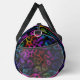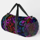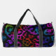 This image showcases a duffel bag with a highly textured and colorful leopard print. The individual spots are filled with a vibrant, almost pixelated or speckled gradient of colors, including various shades of blue, teal, green, yellow, orange, red, and purple. These bright, multi-hued spots stand out dramatically against the solid black background. The bag is equipped with dark, presumably black, carrying straps. This design gives the duffel bag a modern, energetic, and artistic appeal, perfect for making a statement while traveling or heading to the gym.
