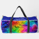This energetic Gear bag showcases a vivid spectrum swirl design, blending blues, greens, yellows, oranges, reds, and purples in a flowing, abstract manner. It’s a distinctive Kit bag and a cheerful Weekender ready for any adventure.