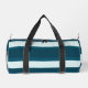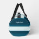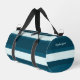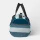 Three-color design with asymmetric stripes. Clean lines in three colors for your sports duffel bag. Add your name or a quote at the front and side. This variant is the sea blue scheme in Prussian blue, midnight green and azureish white.