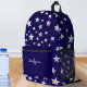 Alcance para las estrellas con su propia mochila personalizada. Esta mochila fresca es azul de medianoche con un patrón de estrellas en finos tonos plateados, azules y rosas. Personalice su nombre inicial, que formará un elegante monograma en el bolsillo delantero. Práctico para la escuela, la universidad, los días de salida, el gimnasio o las compras, esta es una mochila versátil con calidad estrella.