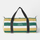 Three-color design with harmonious stripes. Clean lines in three colors for your sports duffel bag. Add your name on the front and a text or motivational quote on the side. This variant is the festive color scheme in green, gold, and white.