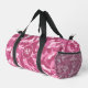 Esta bolsa presenta un bonito estilo de camo en tonos rosa burdeos y blanco roto. Su monograma de triple letra está en blanco dentro de un cartel de círculo rosado en el centro.