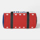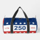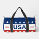 Celebrating the USA's 250th anniversary. Front: These red, white, and blue duffle bags have the word 'USA' in the center. The years 1776 and 2026 are next to USA. The top stripe is blue and has white stars. The center stripe is white. The bottom stripe is red with white stars. Back: These red, white, and blue duffle bags have the '250' in the center. The years 1776 and 2026 are next to 250. The top stripe is blue and has white stars. The center stripe is white. The bottom stripe is red with white stars.