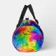 This energetic Gear bag showcases a vivid spectrum swirl design, blending blues, greens, yellows, oranges, reds, and purples in a flowing, abstract manner. It’s a distinctive Kit bag and a cheerful Weekender ready for any adventure.