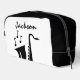Bolso de aseo personalizado con diseño saxofónico. Accesorio de baño con nombre personalizado Guay. Divertido artículo para el jugador, profesor de música, profesor de escuela de música, músico, artista, intérprete, estudiante, propietario de tienda, etc. Elegante plantilla de tipografía de guión. Diseño de instrumentos moderno con nombre. Color negro y blanco o personalizado. Gran regalo para el Día del Padre o el Cumpleaños.