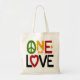 ¡Un amor! Texto alegre y colorido rojo, verde y dorado, "ONE LOVE" incluyendo un SIGNO DE PAZ y CORAZÓN. Esta imagen muestra una cita del Rey del Reggae, y simboliza la música animada, ritmo y ambiente que identifica el género musical Roots/Reggae, la cultura Reggae, Jamaica y la isla caribeña.