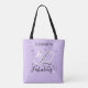 The bag features "Elizabeth" personalized name and "50 and Fabulous" text with black stars and a cute heart shape. Elegant typography design on a feminine, light purple lavender background.