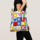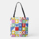 A colorful tote bag over their shoulder. The bag is the star of the scene — a bold patchwork-style design made up of bright geometric blocks, each featuring its own playful pattern.