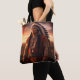 With the golden sunset behind him, a Native American (Indian) Chief, in full dress, is on the front and back of this trendy, white tote bag, with a black strap.