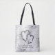 Bolso tote de abedul blanco con dos corazones tallados en un lado. Agrega texto en la parte inferior para un evento de boda, con los nombres de la novia y el novio y la fecha de la boda. Fondo realista de abedul que se envuelve para cubrir el otro lado. Los corazones y el texto están solo en un lado. Este bolso tote de impresión total está forrado y tiene una asa negra. Úsalo como bolsas de bienvenida para los invitados, regálalos a los miembros del séquito nupcial, personalízalos para las damas de honor y las madres.