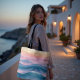 Lujo Costero Moderno. El Swell de la ciénaga se despliega en bandas de barrido de melocotón, lavanda suave y verde azulado profundo, fluyendo rítmicamente a través de un lienzo de arenisca. El motivo de la onda abstracta evoca el pulso sereno de las mareas de crepúsculo. Este elegante tote es perfecto para días de playa, carreras de mercado o para añadir un acento costero artístico a cualquier conjunto.