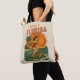 This kitschy throwback beach art is 'only in Florida' energy! A wild pin-up catches a wave as she rides an alligator like a surfboard. The surf beach at sunset scene has bold orange and red colors, complete with palm trees blowing in the tropical breeze. This white sand tote bag is perfect for the beach and stylish enough for everyday use.